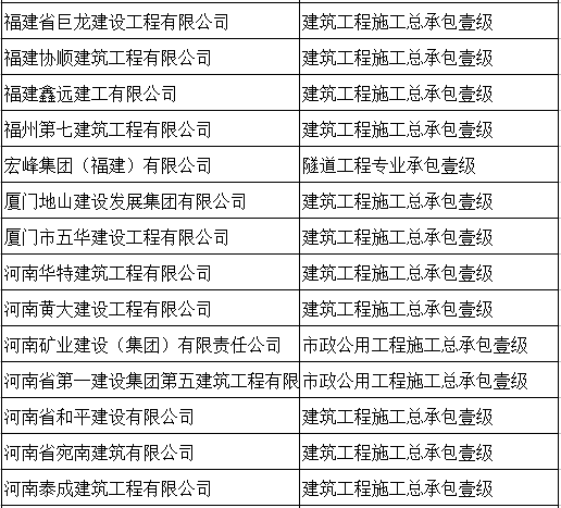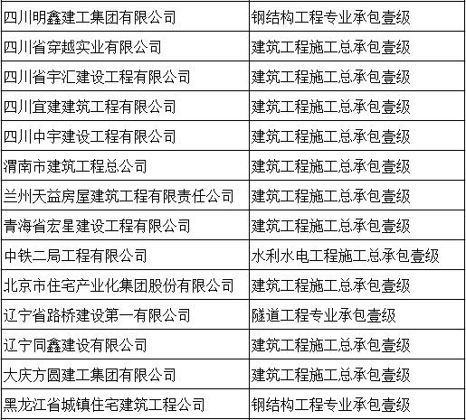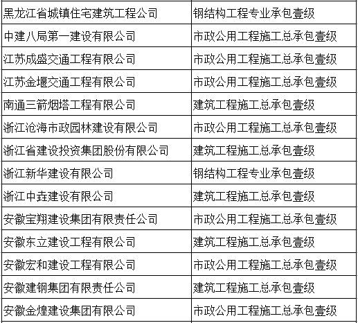 住建部核準2016年第11、12批建設工程企業(yè)資質(zhì)資格名單。共有21家企業(yè)升為特級資質(zhì)(含特級資質(zhì)增項),117家企業(yè)升為一級資質(zhì)(含一級資質(zhì)增項),2家企業(yè)獲得貳級資質(zhì)。